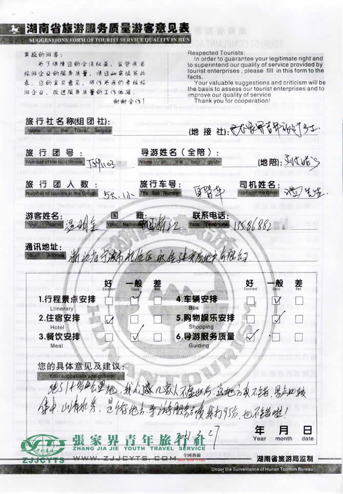 浙江寧波市“溫先生”與張家界青旅旅游顧問——“李 霞”在3月16日取得聯(lián)系,經(jīng)過2次在線溝通商談和電話溝通,最后雙方達(dá)成協(xié)議并簽訂了《國(guó)內(nèi)旅游組團(tuán)標(biāo)準(zhǔn)合同》,于3月22日下午抵達(dá)張家界,之后便開始了湘西之旅。 此次行程是由我們優(yōu)秀導(dǎo)游——?jiǎng)⑽木,?fù)責(zé)旅游接待工作,劉導(dǎo)在旅游過程中講解詳細(xì),服務(wù)周到,客人也很滿意。并給予導(dǎo)游服務(wù)品質(zhì)評(píng)分95分!