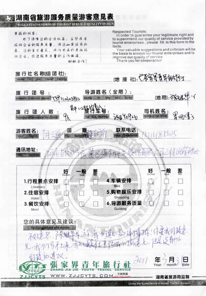 胡先生: 您好!衷心的感謝您選擇我們青旅給您服務(wù),同時(shí)也感謝您對(duì)我們張家界青旅的信任與支持,期盼您再次關(guān)注我們,歡迎您再來(lái)張家界做客,祝您生活幸福,工作順利,--“趙艷芳”留言。2011-4-03