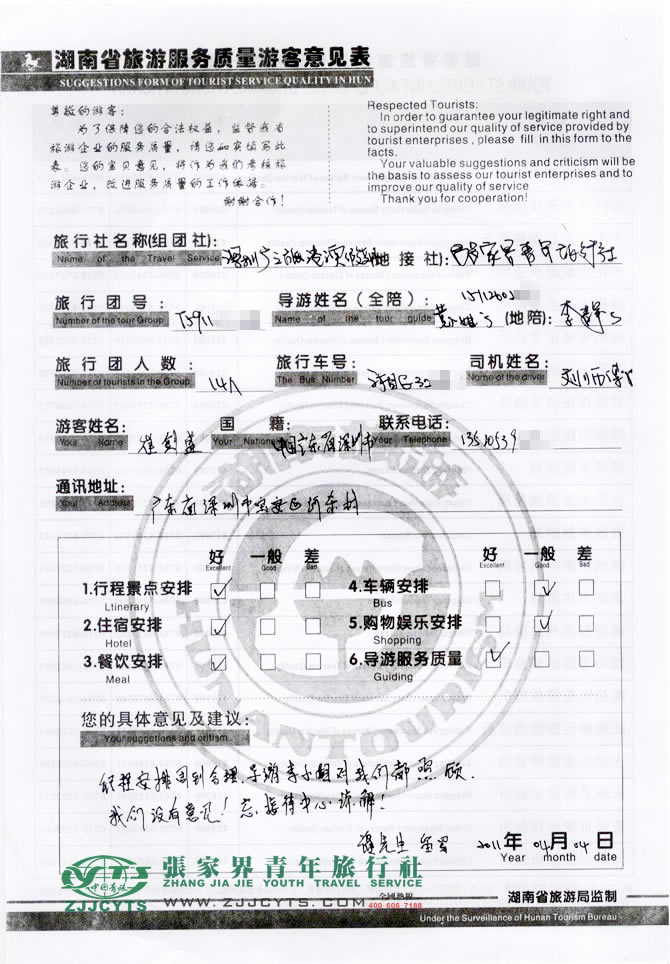 鳴謝“深圳廣之旅港澳假期”-吳總,所給予的合作機(jī)會(huì),同時(shí)也感謝崔先生一行選擇張家界青年旅行社及對(duì)我社安排的配合與支持。我們會(huì)繼續(xù)努力做好旅游接待工作。期待諸位朋友們?cè)俅巫隹兔利惖膹埣医,?lái)到美麗的小城-鳳凰古城,祝一切順利!客服--“卓東來(lái)”留言。2011-04-08