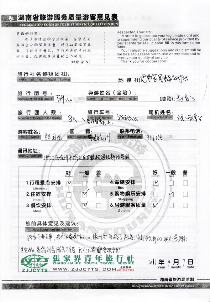 浙江杭州市“張先生”與張家界青旅旅游顧問(wèn)——“田小美”在3月23日取得聯(lián)系,經(jīng)過(guò)3次的在線(xiàn)商談和幾次電話(huà)后,雙方達(dá)成協(xié)議并簽訂了《國(guó)內(nèi)旅游組團(tuán)標(biāo)準(zhǔn)合同》,張先生和朋友8人一行于4月2日中午11:00許抵達(dá)張家界,次日便開(kāi)始了為期5天的走進(jìn)湘西之旅。 此次行程是由我們優(yōu)秀導(dǎo)游——?jiǎng)?香,負(fù)責(zé)旅游接待工作,劉導(dǎo)在旅游過(guò)程中講解詳細(xì),服務(wù)周到,客人也很滿(mǎn)意。并給予導(dǎo)游服務(wù)“服務(wù)不錯(cuò)”評(píng)價(jià)!