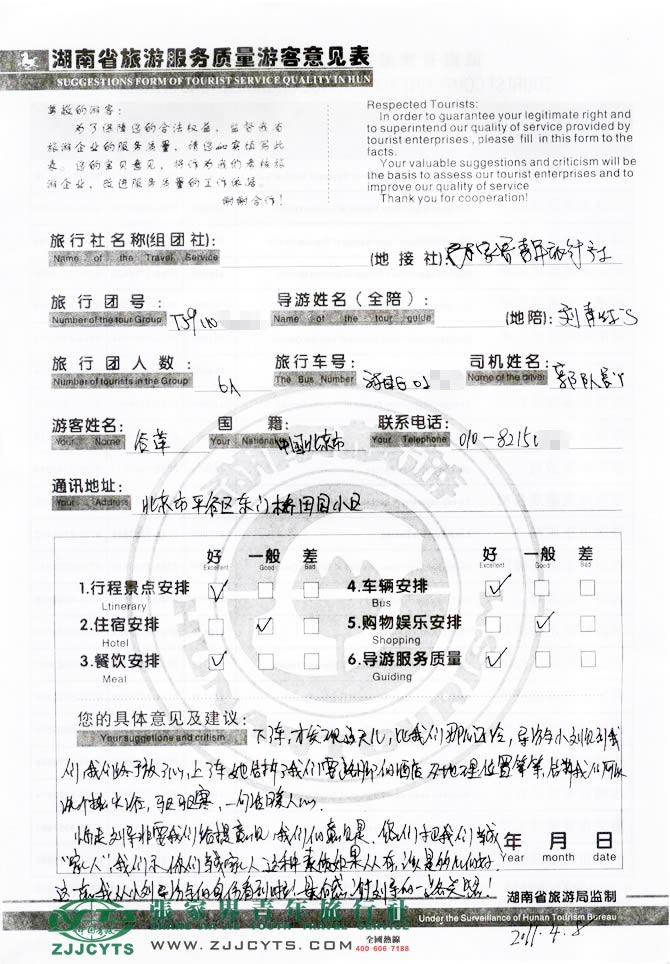 | 再次感謝“北京市谷女士”一行6人選擇張家界青年旅行社,以及您對(duì)張家界青旅的信任與支持。我們會(huì)繼續(xù)努力,做好每一個(gè)旅游接待工作。期待您和您的朋友再次來(lái)到美麗的張家界,祝您工作順利,生活愉快!--“趙艷芳”留言。 |