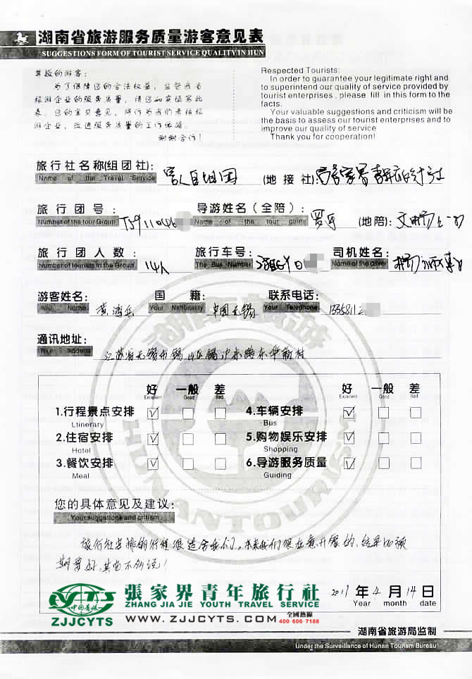 江蘇無錫市“黃先生”與張家界青旅旅游顧問——“田小美”在3月27日取得聯(lián)系,經(jīng)過3次的溝通商談,雙方達(dá)成協(xié)議并簽訂了《國內(nèi)旅游組團(tuán)標(biāo)準(zhǔn)合同》,黃先生14人貴賓一行于4月10日晚抵達(dá)張家界,4月11日上午便開始為期3天行程的玩轉(zhuǎn)湘西之旅。 此次行程是由我們優(yōu)秀導(dǎo)游——文暢暢,負(fù)責(zé)旅游接待工作,文導(dǎo)在旅游過程中講解詳細(xì),服務(wù)周到,客人也很滿意。并給予導(dǎo)游服務(wù)較高的評價!