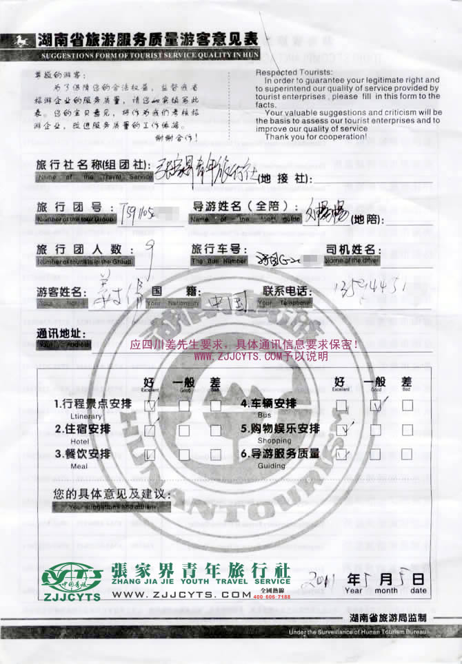 過程細(xì)節(jié)再現(xiàn) :“北京張小姐在4月23日與青旅客服經(jīng)理“張德建先生”取得聯(lián)系,并通過多次在線以及電話溝通,最終在4月26日,雙方達(dá)成共識(shí)并簽訂了《國內(nèi)旅游標(biāo)準(zhǔn)合同》,確立由我方負(fù)責(zé)“北京雅虎公司”貴賓一行9人的接待任務(wù),其中有8人張小姐原籍地四川家人一行于4月29日,自駕車經(jīng)自四川啟程,經(jīng)貴州、常德、澧縣、武陵源等地,晚10點(diǎn)許抵達(dá)張家界市,張小姐1人乘自【北京-張家界】直航飛機(jī)于同日晚也抵達(dá)張家界市,次日之后便開始了3天行程的走進(jìn)美麗的張家界純玩之旅。