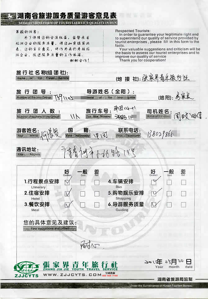 廣東廣州市“何女士”與張家界青旅旅游顧問——客服“李娜”在5月07日取得聯(lián)系,并與廣東廣州何女士,就與之同行人員基本情況以及貴賓的要求,做了深層次的在線溝通,在此過程中,雙方多次溝通最終在5月11日才確立《國內(nèi)旅游組團接待合同》,并委托我社預訂往返聯(lián)程機票。并且確立由我社負責全程接待安排,并與之簽訂了接待服務協(xié)議;何女士一行11人(其中有名老人、三個學齡小孩)一行于5月17日上午09:15點許,飛抵張家界市住宿大成山水國際酒店,之后便開始了4天行程的走進的美麗張家界之旅。 5月20日下午18:00結(jié)束行程,由我司車輛送往長沙高鐵南站搭乘高鐵返程廣州。