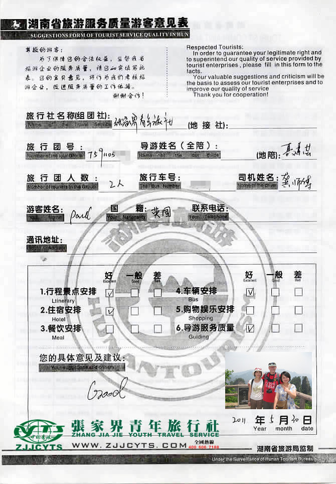 英國利物浦“paul先生”與張家界青旅旅游顧問——1在5月12日取得聯(lián)系,并與廣西柳州梁小姐以及其丈夫paul先生(英國籍貫),就旅游行程和服務(wù)標(biāo)準(zhǔn)等問題、還有返程火車票代訂問題,做了深層次的在線溝通,此后經(jīng)過細(xì)致的商磋,最終在5月21日才確立《國內(nèi)旅游組團(tuán)接待合同》,并委托我社預(yù)訂往返返程火車票。并且確立由我社負(fù)責(zé)全程接待安排;梁女士一行2人于5月28日乘坐K1474次自柳州出發(fā),次日上午九時許抵達(dá)張家界市,我社安排導(dǎo)游“聶素珍”鮮花迎接。之后便開始了3天行程的走進(jìn)的美麗張家界之旅。 5月30日下午16:00許結(jié)束行程,由我司車輛送往張家界火車站。2位貴賓搭乘K1473次返程。