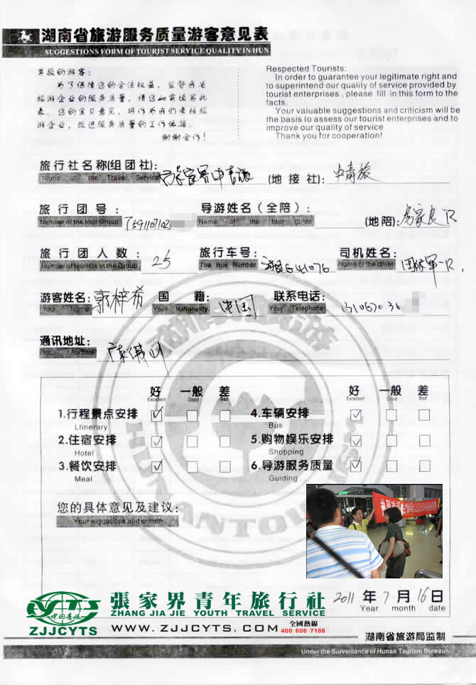 | 在此感謝廣東佛山生命陽(yáng)光一行25位貴賓,給予張家界中青旅為您一行服務(wù)的機(jī)會(huì),同時(shí)也感謝貴賓一行對(duì)我社行程安排及導(dǎo)游服務(wù)給予的高度評(píng)價(jià),以及對(duì)服務(wù)過(guò)程中給予的配合與支持,歡迎各位貴賓再次蒞臨美麗的湘西做客觀光。再次感謝。--客服“田秋萍”留言。 |