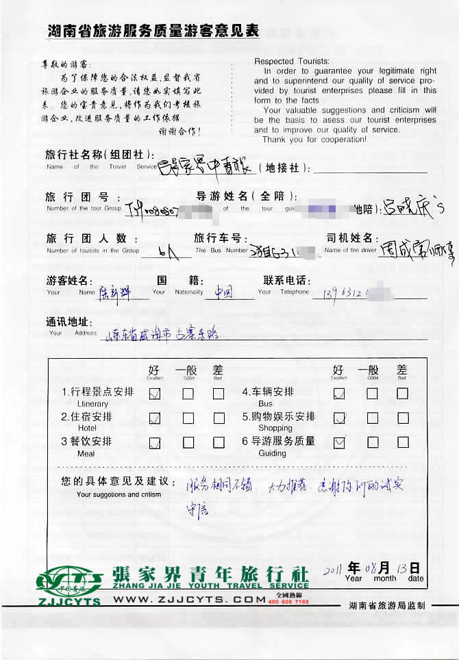 山東威海市“陸先生”與張家界青旅旅游顧問——客服“谷盈”在7月21取得聯(lián)系,并與負(fù)責(zé)此次旅行活動的主要聯(lián)系人“陸先生”,就合理的選擇旅游線路、旅游過程的具體要求、服務(wù)范圍、住宿的安排,做了多次在線溝通和電話溝通,經(jīng)過細(xì)致的商磋,最終在07月31日正式簽訂《國內(nèi)旅游組團接待合同》,由我社負(fù)責(zé)全程接待安排;08月08日陸先生親率貴賓一行6人抵達(dá)長沙參加一個座談會議之后,于08月11日在我司長沙分公司工作人員的協(xié)助之下,搭乘城際大巴于當(dāng)日下午13時間許抵達(dá)張家界,我社導(dǎo)游和司機迎接站,當(dāng)日便開始了為期3天行程的走進(jìn)張家界之旅。 08月13日下午送團,貴賓搭乘城市大巴車返程回長沙,后中轉(zhuǎn)返程。