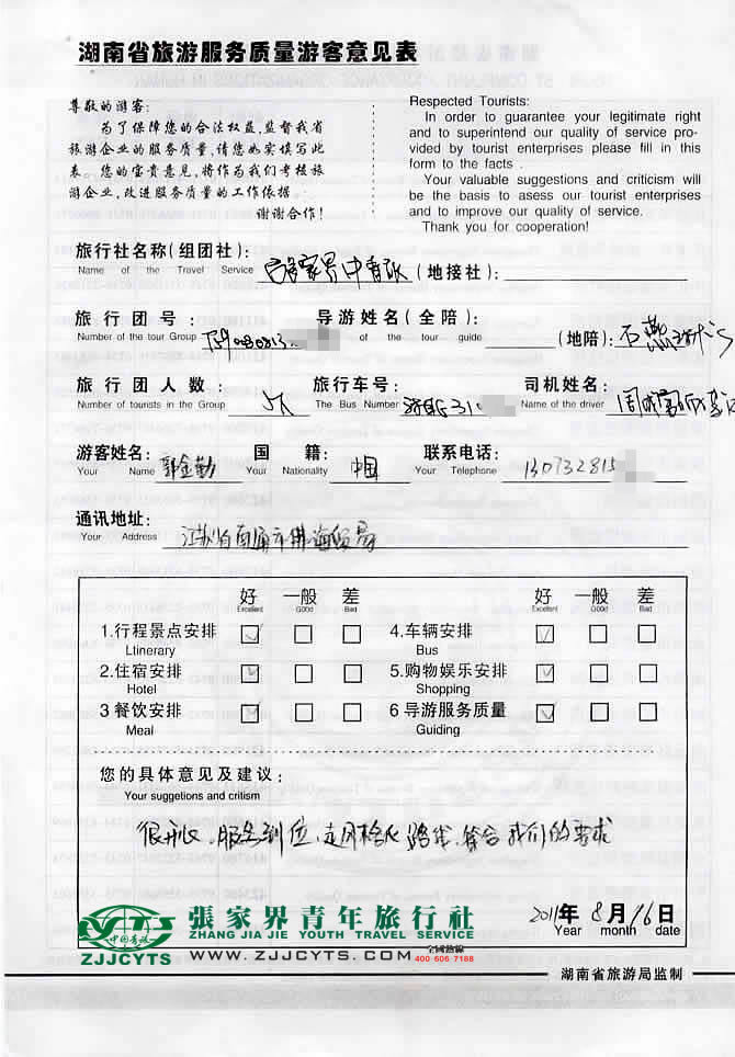 浙江南通市“郭小姐”與張家界青旅旅游顧問(wèn)——客服“黃靜”在7月24取得聯(lián)系,并與負(fù)責(zé)此次旅行活動(dòng)的主要聯(lián)系人“郭小姐”,就選擇合適的旅游線(xiàn)路、旅游過(guò)程的具體要求、服務(wù)范圍、住宿的安排,做了多次在線(xiàn)溝通和電話(huà)溝通,經(jīng)過(guò)細(xì)致的商磋,最終在08月05日正式簽訂《國(guó)內(nèi)旅游組團(tuán)接待合同》,由我社負(fù)責(zé)全程接待安排;并委托我社代訂返程飛機(jī)票,08月13日郭小姐一行5人飛抵長(zhǎng)沙,在長(zhǎng)沙停留并處理了相關(guān)事務(wù)之后;于08月14日,5位貴賓搭乘長(zhǎng)途城際大巴于當(dāng)日下午19時(shí)許抵達(dá)張家界,我社導(dǎo)游和司機(jī)迎接站,次日便開(kāi)始了為期2天行程的走進(jìn)張家界自然之旅;于08月16日下午送團(tuán),貴賓搭乘張家界返程赴長(zhǎng)沙的城市大巴返程,后在長(zhǎng)沙做中轉(zhuǎn)返程。