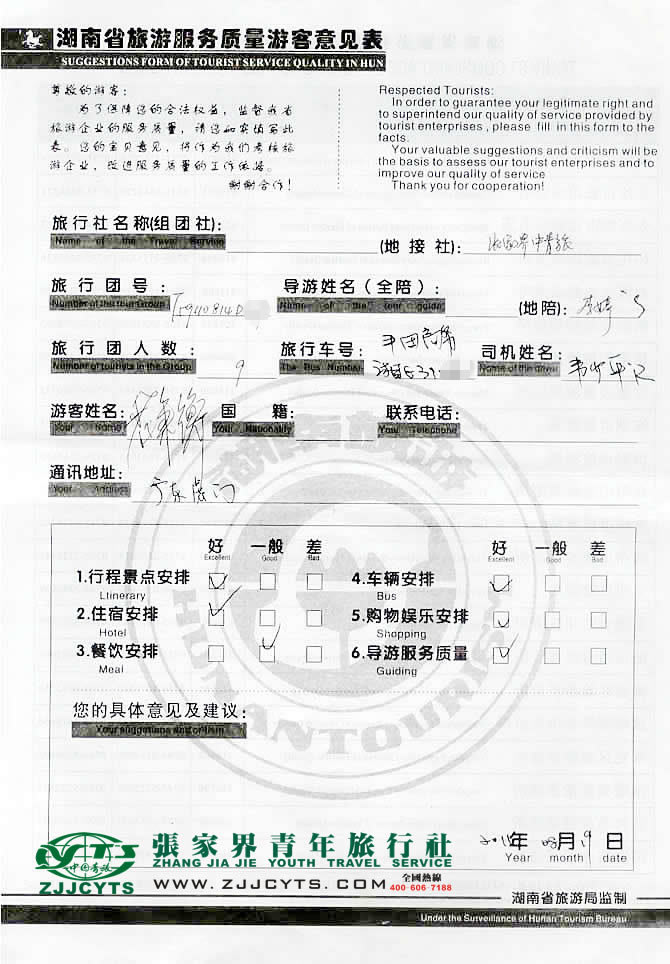 廣東東莞“白先生”與張家界青旅旅游顧問——客服經(jīng)理“張德建”先生在7月31取得聯(lián)系,就合理選擇旅游線路景點、旅游過程的具體要求、服務(wù)范圍,與此次旅游活動聯(lián)系人白先生做了多次在線溝通和電話溝通,經(jīng)過細致的商磋,最終在08月07日雙方簽訂了《國內(nèi)旅游組團接待合同》,正式確立由我社負責(zé)全程接待安排;白先生一行9人(3人滿70歲老人、3位初中學(xué)生、3位成年人),于08月15日下午中午12點許抵達長沙,我社安排導(dǎo)游和司機在長沙高鐵南二環(huán)接站,搭乘我司安排的商務(wù)車,于當(dāng)日下午17點許抵達張家界市,次日便開始了為期4天行程的走進魅力湘西之旅。 08月16日上午游覽鳳凰古城后,中午啟程自鳳凰返程赴長沙,歡送貴賓搭乘高鐵返程回廣州