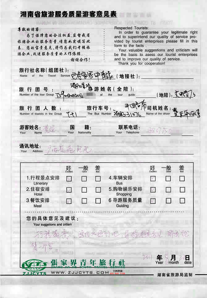 廣西貴港市“黃女士”與張家界青旅旅游顧問——客服經(jīng)理“李朝陽(yáng)”在08月13日取得聯(lián)系,并就線路、行程的合理選擇、旅游景點(diǎn)的選定,以及服務(wù)的具體要求、范圍,做了多次在線溝通和電話溝通,經(jīng)過細(xì)致的商磋,最終在08月15日雙方簽訂了《國(guó)內(nèi)旅游組團(tuán)接待合同》,并正式確立由我社負(fù)責(zé)全程接待安排;黃女士一行3人,于08月18下午乘坐K1473次空調(diào)特快,于次日8月19上午09:11許抵達(dá)張家界火車站,我社導(dǎo)游和司機(jī)前往迎接站,當(dāng)日便開始了為期3天行程的走進(jìn)魅力張家界之旅。 08月22日下午16:00許行程結(jié)束,搭乘18:30分始發(fā)的K1473次返程赴貴港。