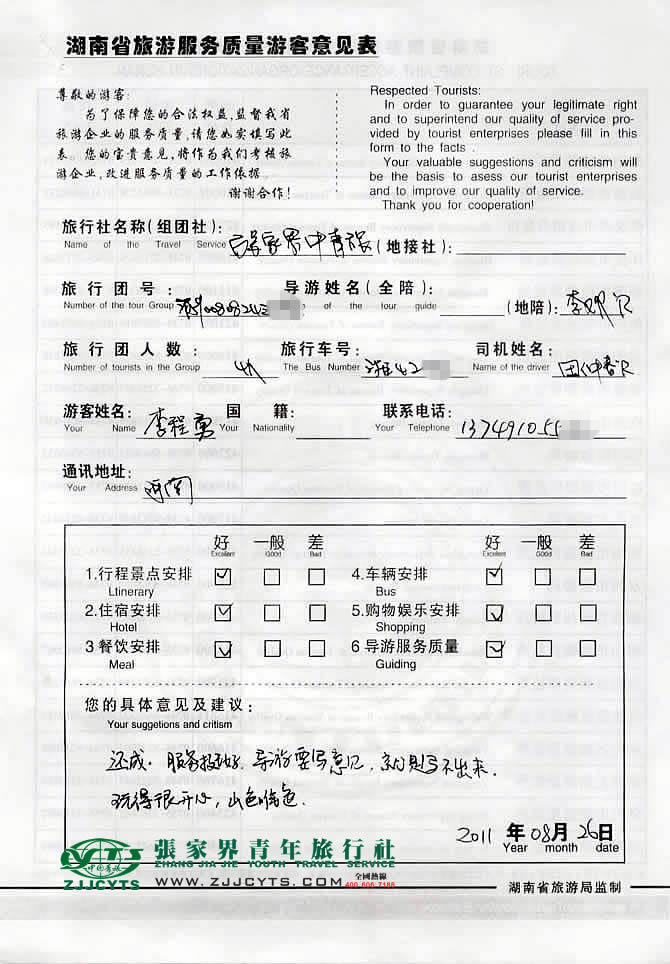 河南鄭州市“李先生”與張家界青旅旅游顧問——客服“黃靜”在08月17日取得聯(lián)系,并就線路、行程的合理選擇、旅游景點的選定,以及服務的具體要求、范圍,做了多次在線溝通和電話溝通,經(jīng)過仔細的商磋,最終在08月19日雙方簽訂了《國內(nèi)旅游組團接待合同》,并正式確立由我社負責全程接待安排;李先生一行4人貴賓于08月22上午乘坐1645次,于次日8月23上午7:40許抵達張家界火車站(晚點20余分鐘),我社導游和司機前往迎接站,當日便開始了為期4天行程的湘西之旅,08月26日中午午餐后返程張家界,于當日下午18點,搭乘K268次返程。