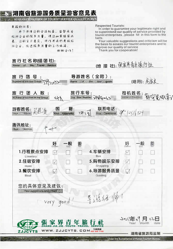 在此向廣州晶爾曼首飾有限公司吳總一行14位貴賓致以衷心的感謝,感謝您給予我們中青旅為您一行服務的機會,同時也感謝貴賓一行對我社行程安排及導游服務給予的高度評價,歡迎各位貴賓再次蒞臨美麗的張家界做客觀光,順祝商祺。--客服經理“李超陽”留言。