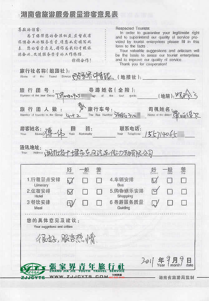 湖北十堰市“傅先生”與張家界青旅旅游顧問——客服“黃靜”在09月03日取得聯(lián)系,并就線路、行程的合理選擇、旅游景點的選定,以及服務(wù)的具體要求、范圍與湖北十堰的傅先生,做了多次在線溝通和電話溝通,最終在09月02日雙方簽訂了《國內(nèi)旅游組團接待合同》,并正式確立由我社負責全程接待安排;傅先生、龔女士一行6人,于09月06上午08點許抵達張家界【搭乘車次是1606次列車】,與當日參加我社散拼純玩成團,便開始了為期4天行程的經(jīng)典之旅,該行程于09月09日下午13:00許在吉首結(jié)束【貴賓要求在吉首返程】,貴賓一行搭乘1608次列車返程,
