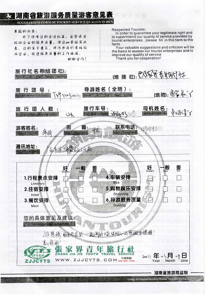 廣東湛江市“席女士”與張家界青旅旅游顧問——陳苑梅在2月25日取得聯(lián)系,經過幾次的商談,雙方達成協(xié)議并簽訂了《國內旅游組團標準合同》,于3月03日中午抵達張家界,次日便開始了湘西之旅。 此次行程是由我們優(yōu)秀導游——房家良,負責旅游接待工作,房導在旅游過程中講解詳細,服務周到,客人也很滿意。并給予導游服務“工作熱情,服務態(tài)度好”的評價!