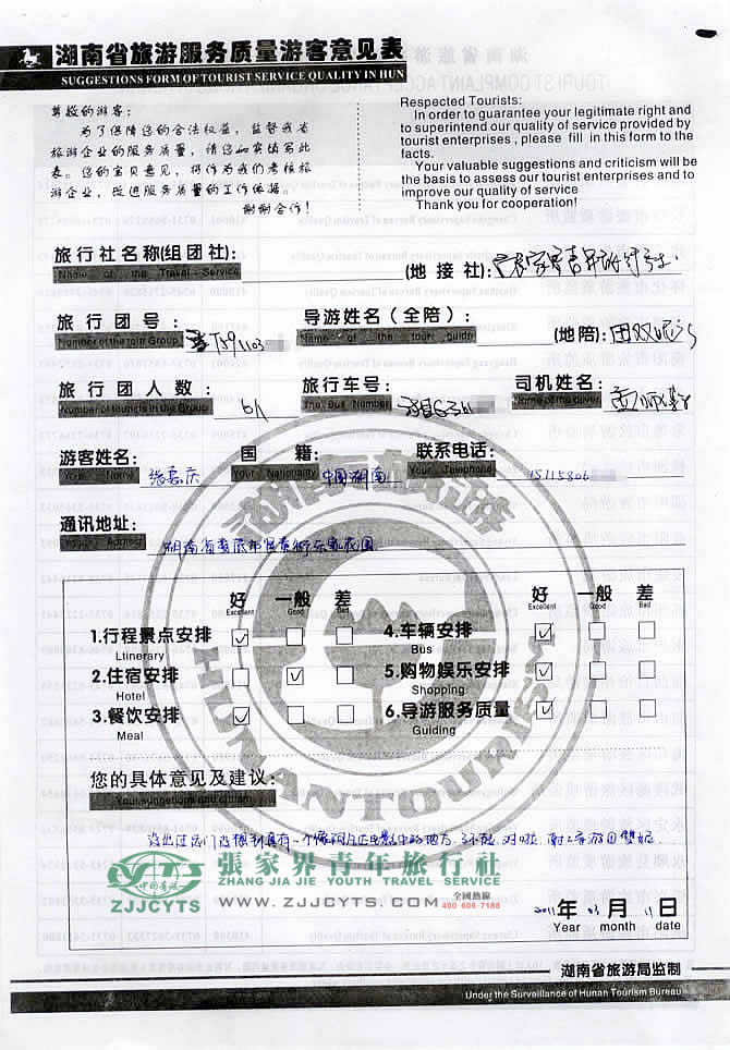 湖南婁底市“張先生”與張家界青旅旅游顧問——張瑜珂在03月06日取得聯(lián)系,經(jīng)過2次的商談,雙方達成協(xié)議并簽訂了《國內(nèi)旅游組團標準合同》,于3月08日晚抵達張家界,次日便開始了湘西之旅。 此次行程是由我們優(yōu)秀導游——田雙妮,負責旅游接待工作,田導在旅游過程中講解詳細,服務周到,客人也很滿意。并給予導游服務品質(zhì)高評價!