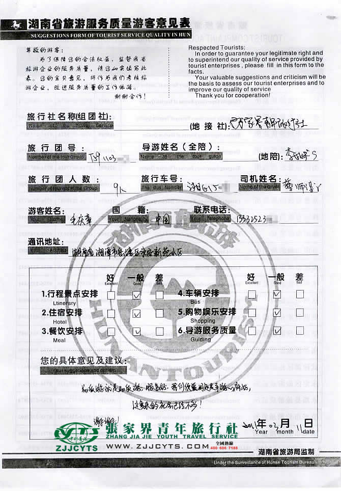 湖南湘潭市“毛先生”與張家界青旅旅游顧問——卓東來在3月2日取得聯(lián)系,經(jīng)過2次的確認商談,雙方達成協(xié)議并簽訂了《國內(nèi)旅游組團標準合同》,于3月08日下午抵達張家界,之后便開始了湘西之旅。 此次行程是由我們優(yōu)秀導游——李世妹,負責旅游接待工作,李導在旅游過程中講解詳細,服務周到,客人也很滿意。并給予導游服務“導游心底好”等評價!