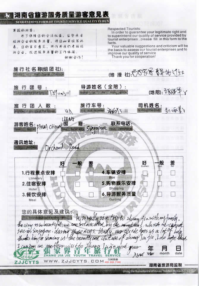 “我和我的家人,非常榮幸的來到中國張家界這么美麗的城市,我為這里的山川陶醉不已,這在新加坡城是見不到的,我們的導(dǎo)游陳繼華此次陪同的這幾天,讓我們了解到了中國以及張家界得文化和歷史,讓我們受益非淺。我希望下次有機(jī)會能夠來到中國,謝謝旅行社的安排。” |