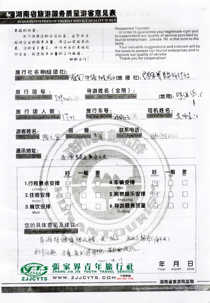 海南?谑“陶先生”與張家界青旅旅游顧問——曹娟在3月08日取得聯(lián)系,經(jīng)過2次的商談,雙方達(dá)成協(xié)議并簽訂了《國內(nèi)旅游組團(tuán)標(biāo)準(zhǔn)合同》,于3月13日晚上抵達(dá)張家界,之后便開始了愉快的湘西之旅。 此次行程是由我們優(yōu)秀導(dǎo)游——陳繼華,負(fù)責(zé)旅游接待工作,陳繼華導(dǎo)游在旅游過程中,服務(wù)周到,景點(diǎn)講解詳細(xì),客人非常滿意。并給予“導(dǎo)游很不錯(cuò),我們由衷的感謝他”等好評(píng)!