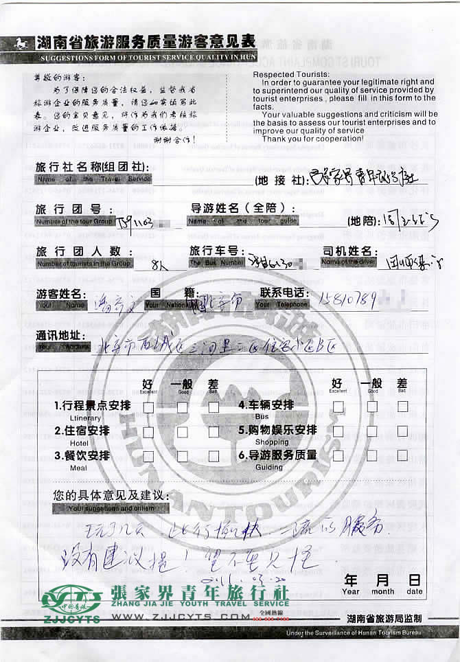 北京西城區(qū)“潘先生”與張家界青旅旅游顧問(wèn)——李芳瓊在3月10日取得聯(lián)系,經(jīng)過(guò)2次的商談,雙方達(dá)成協(xié)議并簽訂了《國(guó)內(nèi)旅游組團(tuán)標(biāo)準(zhǔn)合同》,于3月16日晚上抵達(dá)張家界,便開始了愉快的湘西之旅。 此次行程是由我們優(yōu)秀導(dǎo)游——周玉紅,負(fù)責(zé)旅游接待工作,周玉紅導(dǎo)游在旅游過(guò)程中,服務(wù)周到,景點(diǎn)講解詳細(xì),客人也非常滿意。并給予了“一流服務(wù)”的好評(píng)!